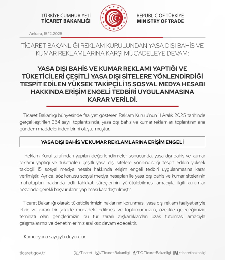 Bakanlık sosyal medya hesabından yapılan duyuruda, yasa dışı bahis ve kumar reklamı yaptığı ve tüketicileri çeşitli yasa dışı sitelere yönlendirdiği tespit edilen yüksek takipçili 15 sosyal medya hesabına erişim engeli tedbiri uygulanmasına karar verildiği belirtilirken, kararın 7258 sayılı Kanun kapsamında Reklam Kurulu’nun yetkileri doğrultusunda alındığı kaydedildi.